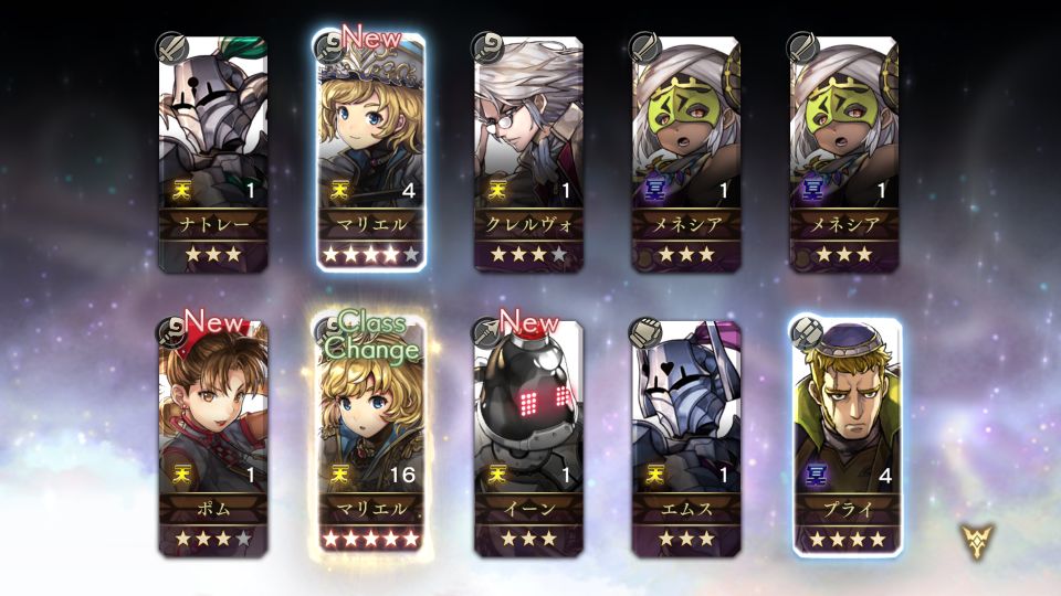 マリエル来ちゃった。しかも★4→★5被りという謎の流れ。でもクリア後にヒーラーは、まぁ天ヒーラーはうれしいかな。あとマリエルの声がかなり低めで面食らい。いやむっりゃ幼顔だし。