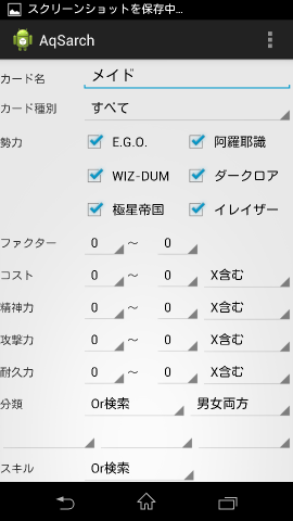 アクエリの持つカード情報はかなり多く、入力フォームを用意していくとどうしても1画面に収まりきらない。そのためスクロールバーを用意することになるのだが、これとSpinner(コンボボックス)、EditText(テキスト入力ボックス)が合わさると相性悪いということが分かった。具体的にはSpinnerでアイテムを選択すると強制的にEditTextが表示される所までまでスクロールする。カード名を入力するエリアは上のほうにあるため、下のほうにある項目(たとえばスキル選択)を複数選ぼうとすると画面が動きまくる(動かしまくる)ため非常にストレスがたまる。